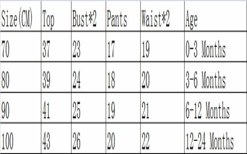 100 Top length: 16.93 Bust*2: 10.24 Pants length: 7.87 Waist*2: 8.66 Age: 12-24 Months