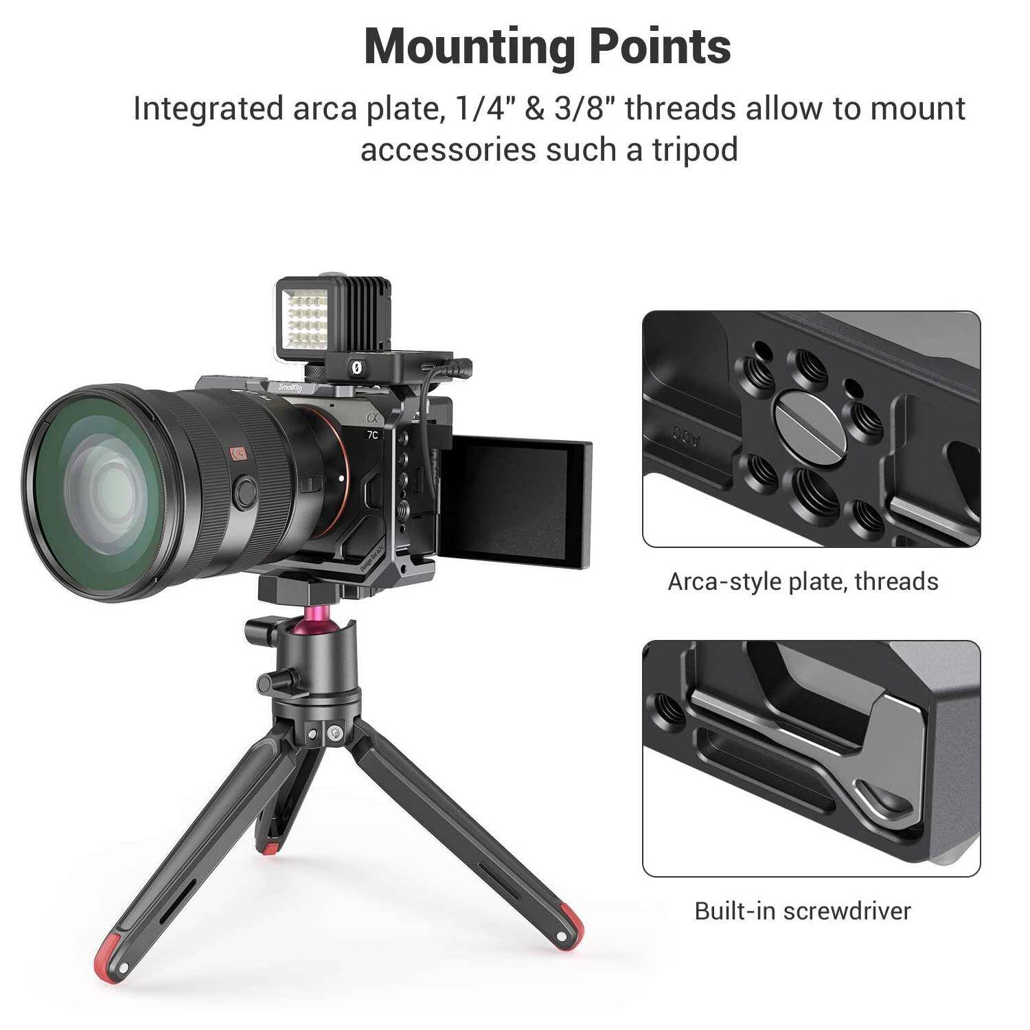 4. Built-in Screwdriver, Integrated Arca Plate, and Cold Shoe Mount.