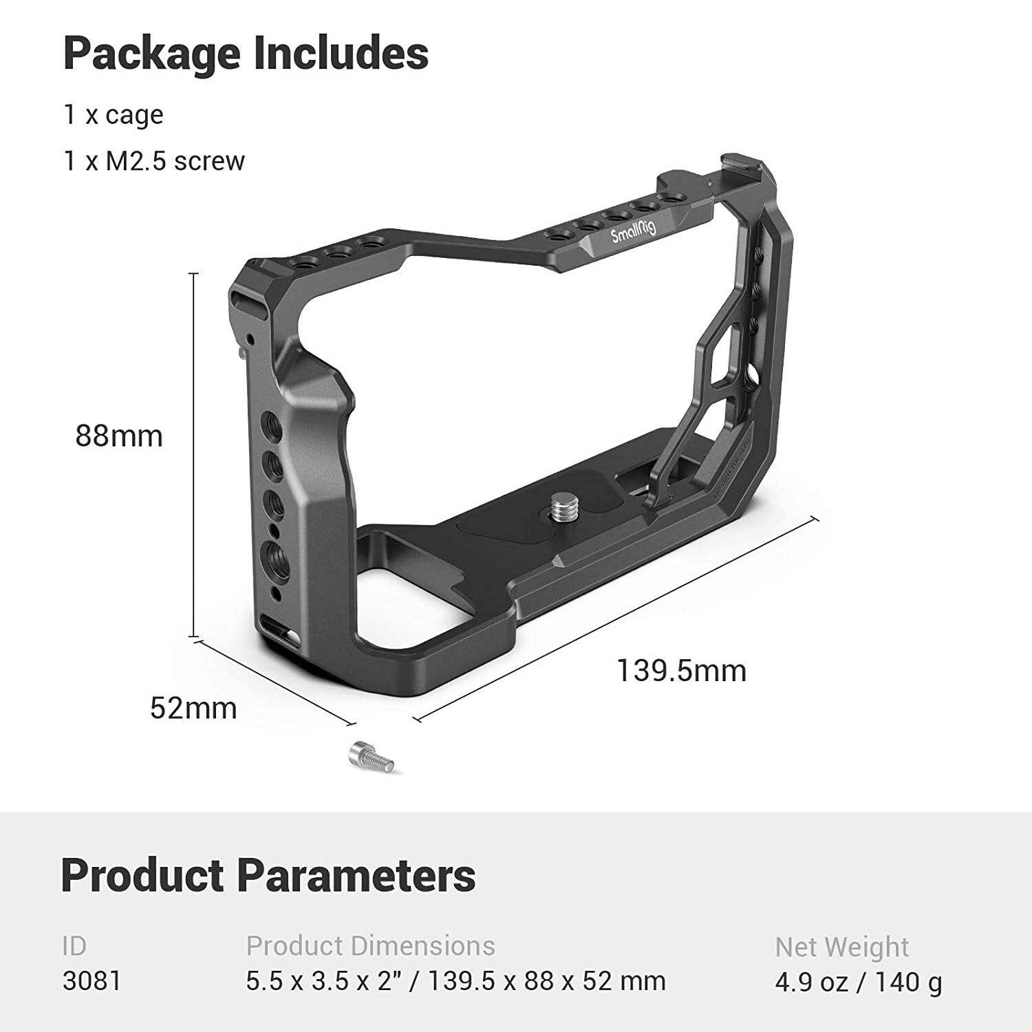 SmallRig Cage for Sony A7C 3081 is a form-fitting full cage specifically designed for Sony A7C. It is lightweight and compact. To maximize the mounting options, the cage can be seamlessly integrated to the camera and features multiple 1/4”-16, 3/8”-20, ARRI thresholds, and cold shoe, which enable filmmakers to set the whole rig up within the compact body of the cage. With a built-in Arca-Swiss quick release system, the cage allows the fast switch between tripod shooting, handheld shooting, and gimbal shooting. The cage secures the camera via a 1/4”-20 screw on the bottom and an m2.5 screw on the right side to further prevent twisting. Additionally, the lightweight and ergonomic design are able to boost the grip experience to the greatest extend.