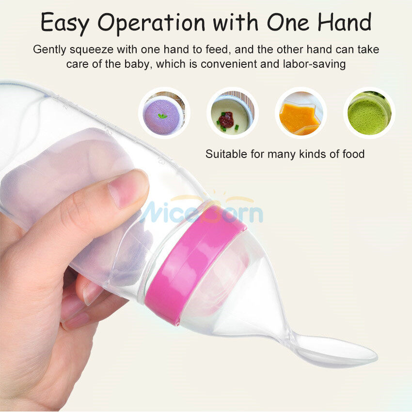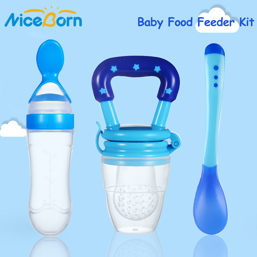 NiceBorn 3PCS Baby Food Feeder Kit Squeeze Feeding Bottle with Spoon Baby Bite Pacifier Temperature Spoon Fruit Vegetable Feeder Squeezing Food Bottles Rice Paste Juice Feeder Infant Fruit Feeder Paci