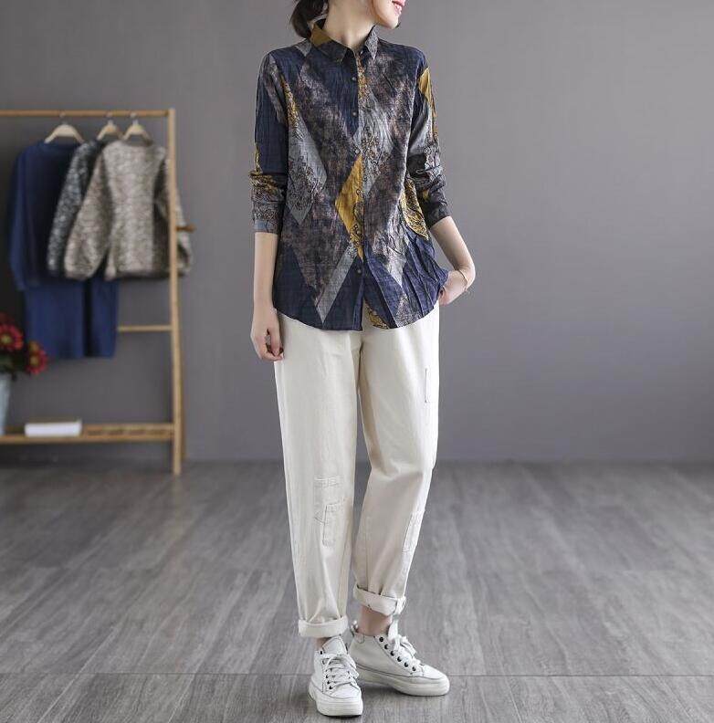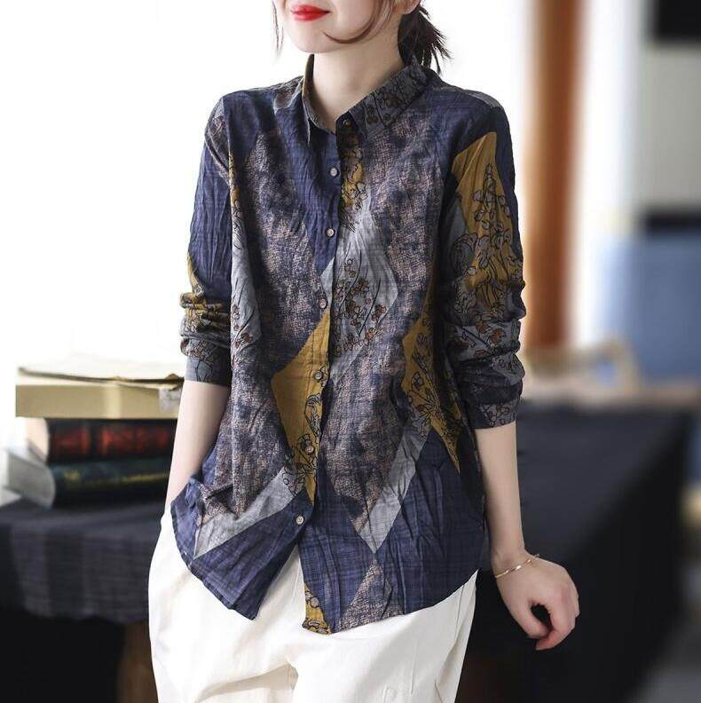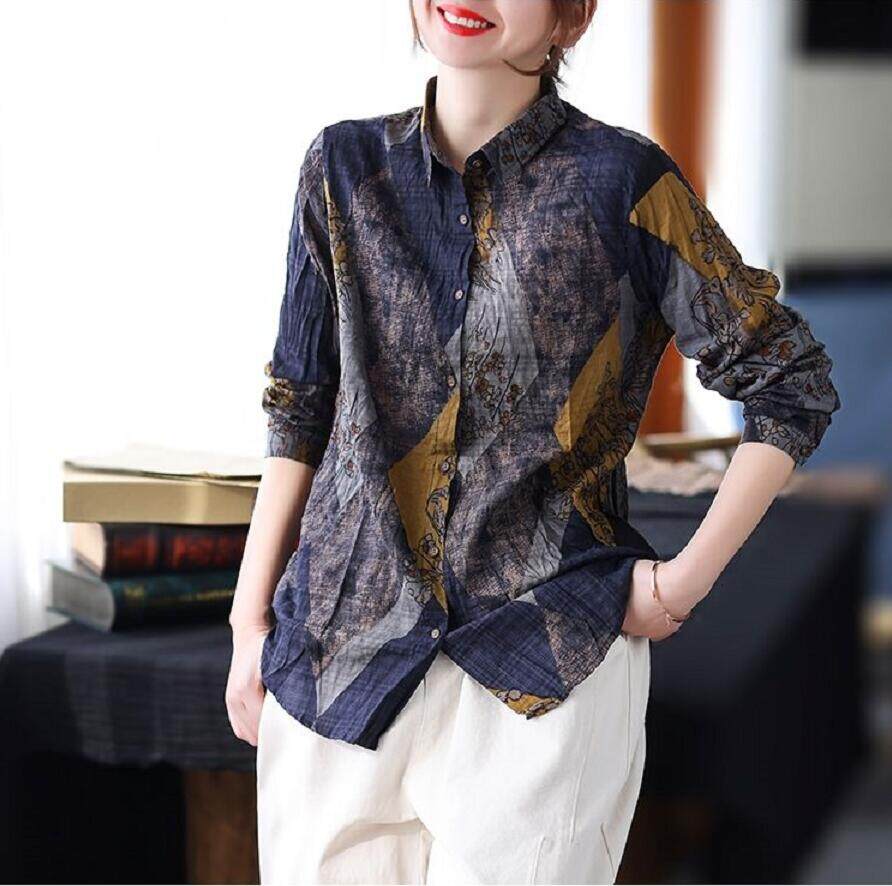 EDQRDQ Women's Long Sleeve Cotton Linen Shirt Button Down Floral Print Blouse Long Sleeve Tunic Tops