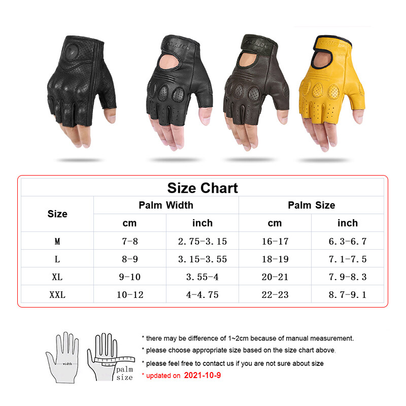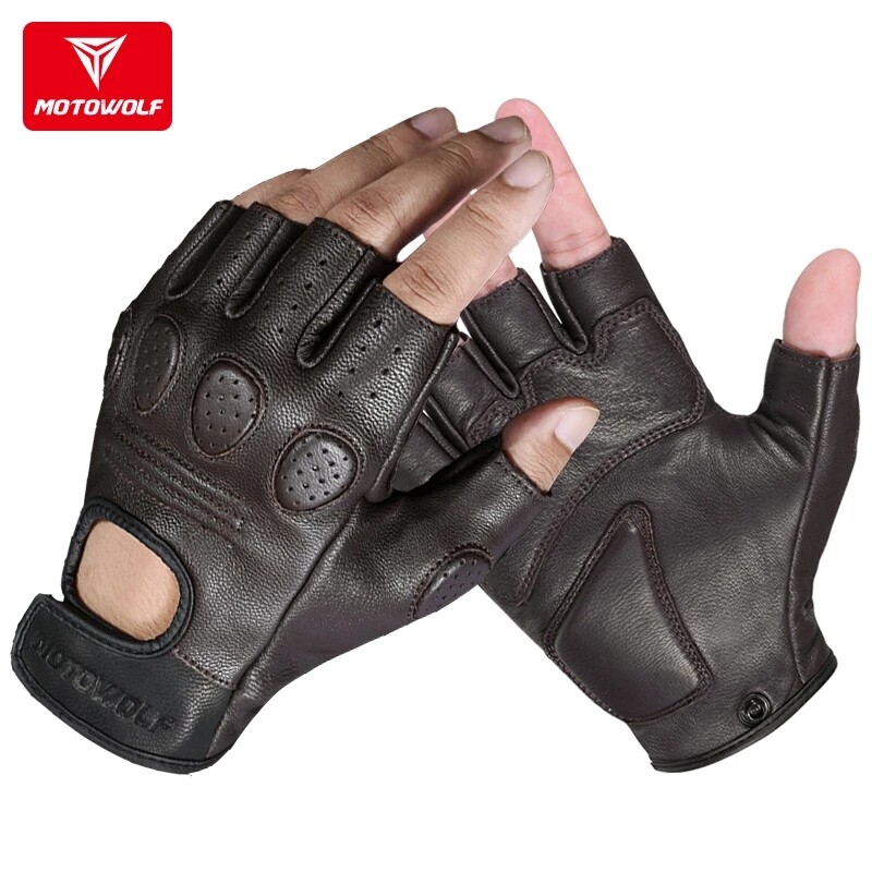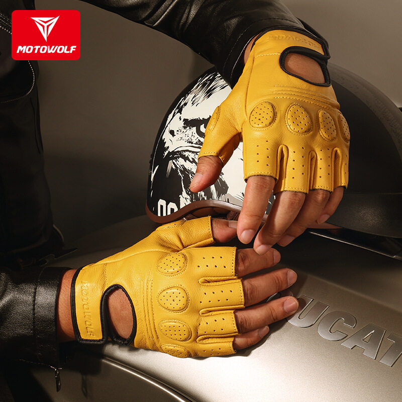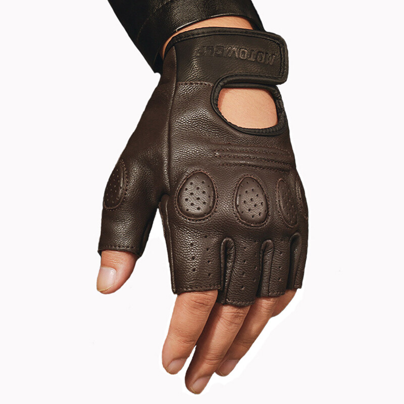 SltcrPasion Half Finger Riding Motorcycle Gloves Sheepskin Leather Moto Cycling Fingerless Gloves Tactical Retro Anti Slip Wrist Adjustable Motowolf