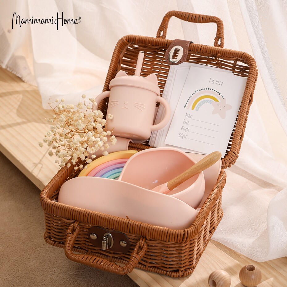 Mamimami Home Baby Meal Feeding Set 100% Silicone Bowl,Sippy Cup,Bib Natural Rattle Toy Toddler Gift with Rattan Box