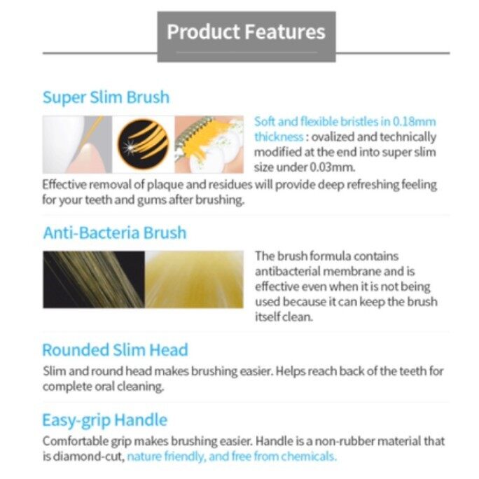 - super slim brush- rounded slim head- antibacterial effect- easy-grip handle