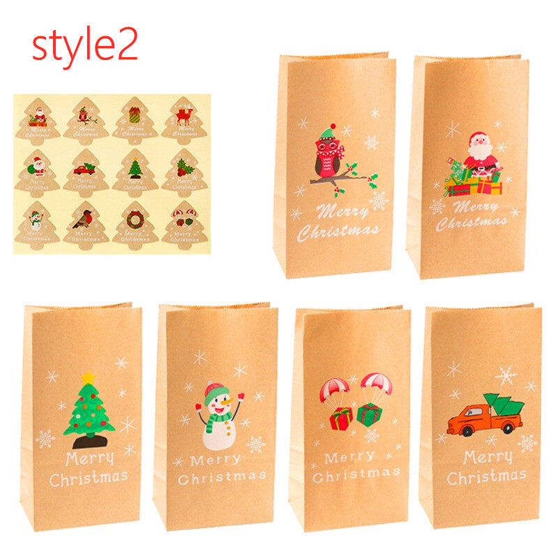 12Sets Christmas Kraft Gift Bags Santa Snowman Xmas Tree Paper Bag With Stickers Party Favor Wrapping Supplies Envelopes
