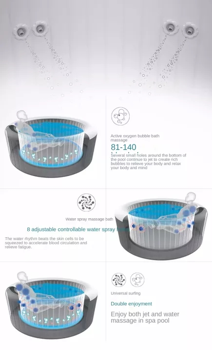 size:180*66cm round spa inflatable pool suitable for 2-4 people (60001#)196*61cm round spa inflatable pool suitable for 4-6 people (60011#)180*180*71cm square spa inflatable pool suitable for 4-6 people (60021#)180*180*71cm square spa inflatable pool suitable for 4-6 people (60031#)