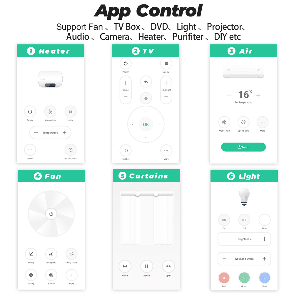 With this Universal IR Remote Control, you can use your smart phone to control home appliances, such as STB(Set-Top-Box), TV Box, TV, Air Conditioner, Fan, DVD, and Curtanins, Roller Shutter, Window Pusher,Hanger, Projection Screen, Garage Door, RF devices etc.