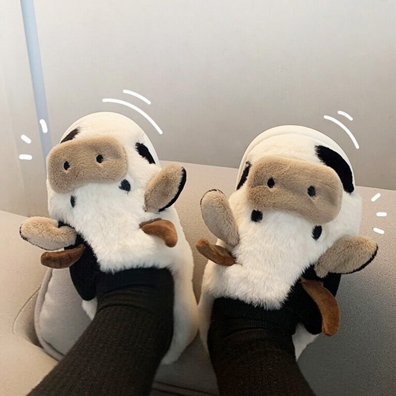 Cute Animal Slipper For Women Girls Fashion Kawaii Fluffy Winter Warm Slippers Woman Cartoon Milk Cow House Slippers Funny Shoes