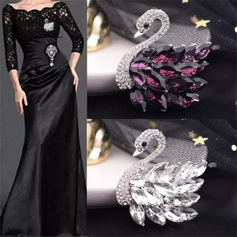 Elegant Swan Amethyst Flower Brooch Diamond Pin Ladies Luxury Pearl Crystal Silver Plated Fashion Clothes Accessories
