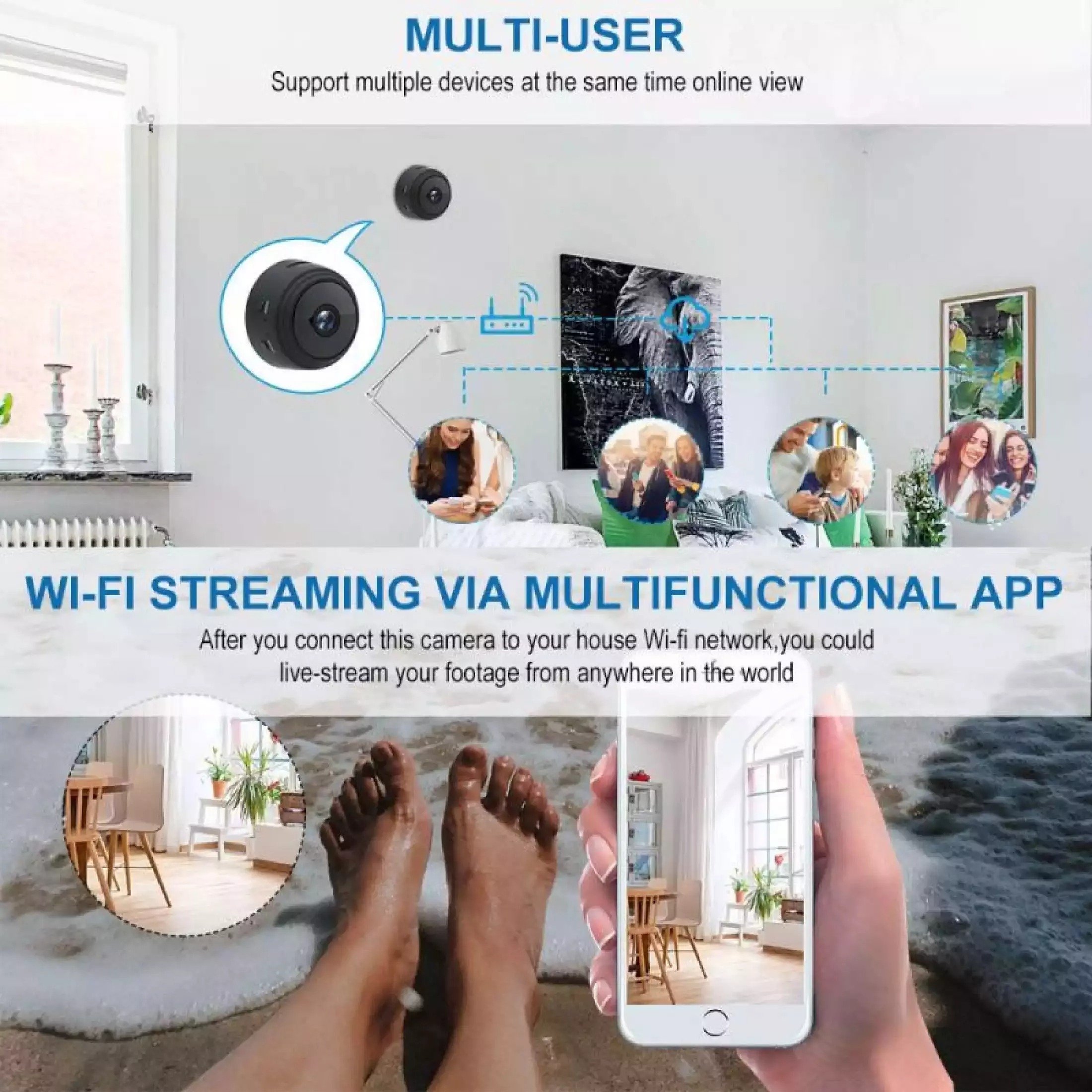 - 1080P Full HD Brings You A Different Experience. This wireless IP camera lets you view real-time what's happening inside your home or office even while you're on a vacation or a quick business trip. The remote view can be accessed via the - - - APP(little star) using iOS and Android smartphones. - This wireless IP camera can work on WiFi (2.4GHz WiFi only) or No WiFi. When it works on No WiFi, insert a TF card (TF card not include) and turn on, the camera will recording and saves the video files to the TF card (TF card not include). - Night vision & motion detection & alarm push, those functions are the basis for this indoor security camera. You can not only see things in the dark but also capture anybody who is moving in the camera. - This small camera bathroom has a built-in magnet, can work well with any iron material, easily place anywhere. This small camera with a rigid charging cable and magic base, when charging while recording, you can manually rotate the recording angle 360 degrees.
