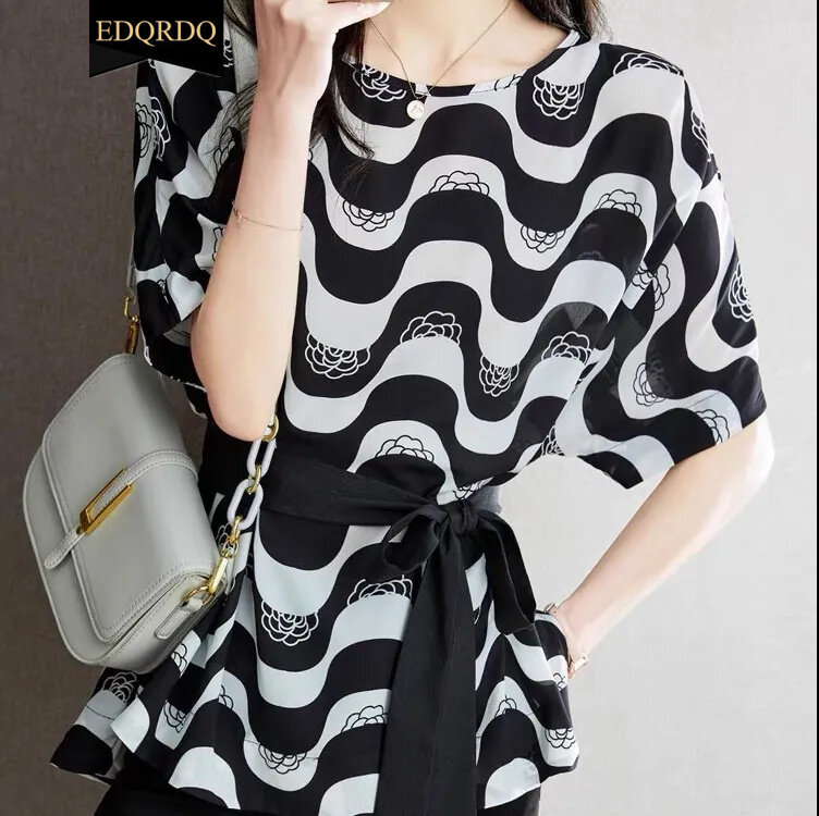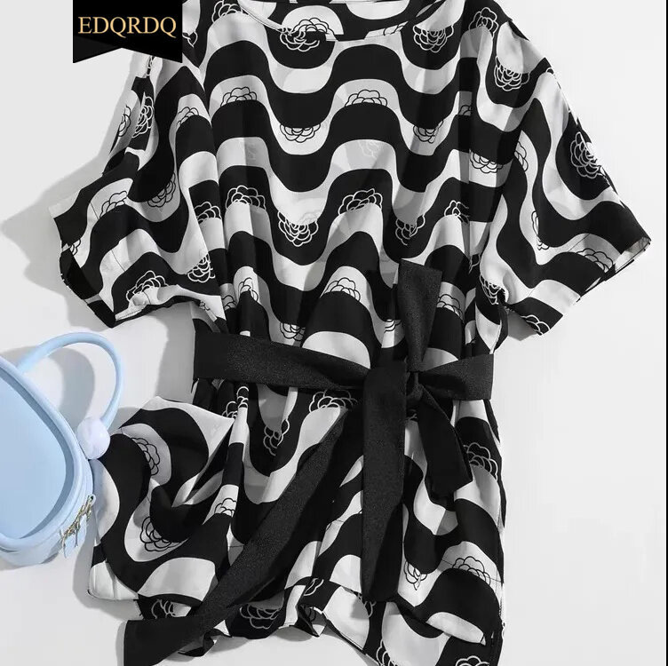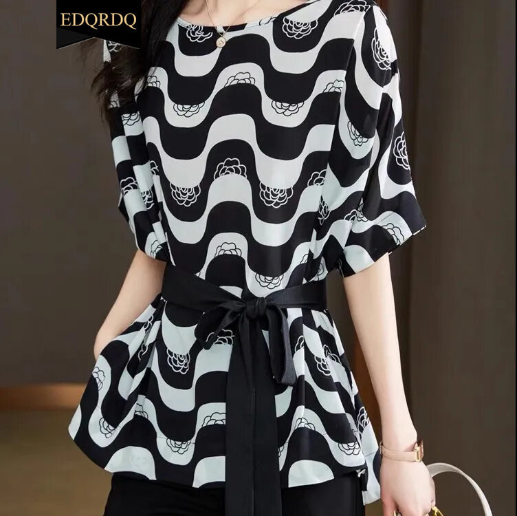 EDQRDQ Women's Boat Neck Striped Short Sleeve Peplum Tie Front Knot Casual Loose Blouse