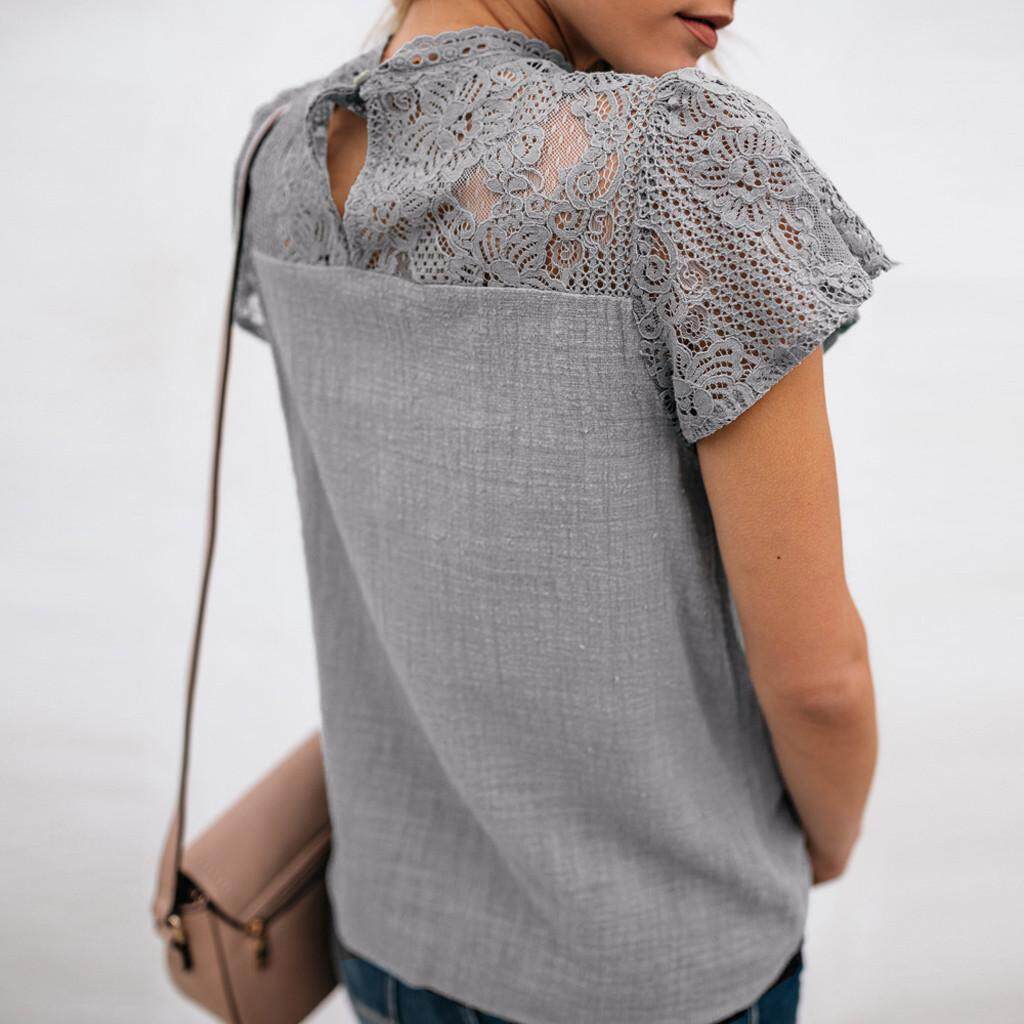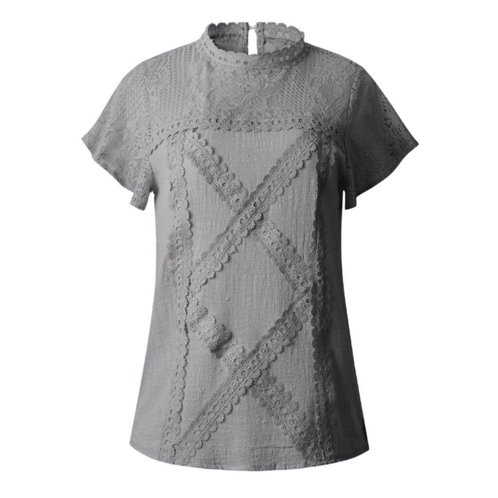 Womens Lace Patchwork Flare Ruffles Short Sleeve Cute Cotton Shirt Blouse Top Plus Size Loose Casual