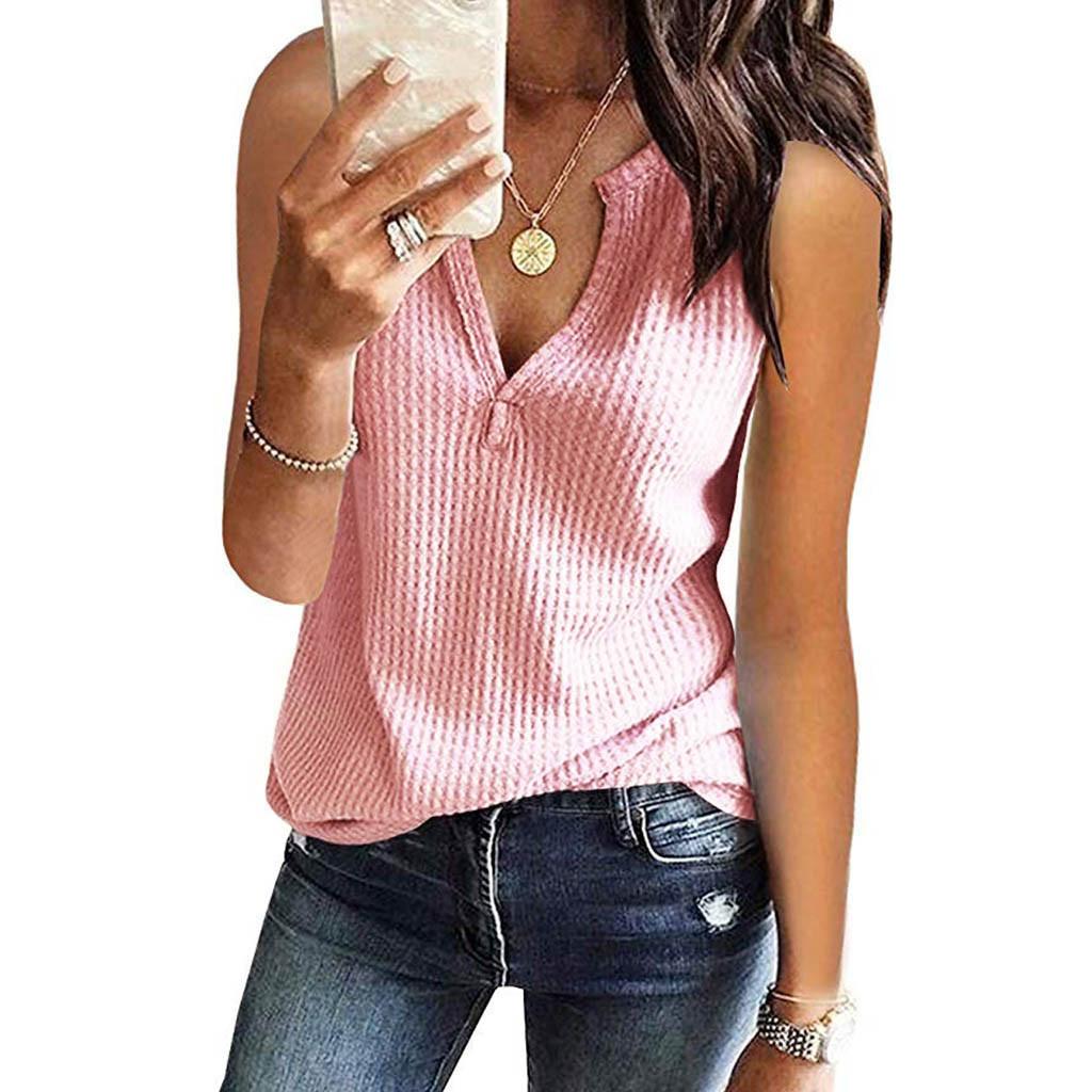 Dunnshop Summer Blouse Shirt Womens Fashion V Neck Shirts Sleeveless Solid Waffle Knit Loose Fitting Tee Tops
