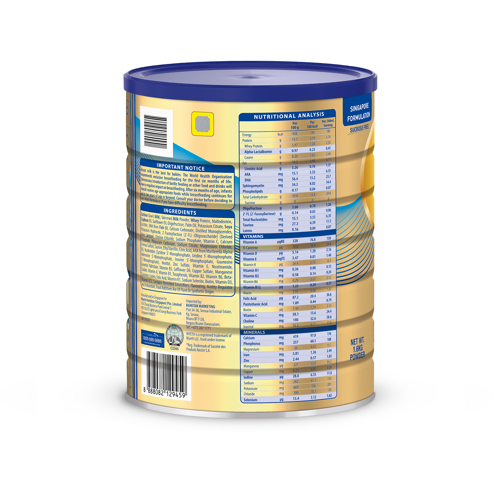 Lactose (Cow’s Milk), Skimmed Milk Powder, Whey Protein, Maltodextrin, Soybean Oil, Sunflower Oil, Oligofructose, Palm Oil, Potassium Citrate, Soya Lecithin, DHA from Fish Oil, Calcium Carbonate, Distilled Monoglycerides, Potassium Hydroxide, 2’-Fucosyllactose (2’-FL) (Oligosaccharide) (Derived from Lactose), Choline Chloride, Sodium Phosphate, Vitamin C, Calcium Phosphate, Potassium Carbonate, Sodium Citrate, Magnesium Chloride, Ferrous Sulfate, Taurine, Ethyl Vanillin, Citric Acid, ARA from Mortierella Alpina Oil, Nucleotides (Cytidine 5'- Monophosphate, Uridine 5’- Monophosphate, Adenosine 5'- Monophosphate, Inosine 5'-Monophosphate, Guanosine 5’-Monophosphate), Inositol, Zinc Sulfate, Vitamin E, Nicotinamide, Ascorbyl Palmitate, Vitamin B5, Safflower Oil, Copper Sulfate, Manganese Sulfate, Vitamin A, Vitamin B1, Tocopherols, Vitamin B2, Vitamin B6, Beta-Carotene, Lutein, Folic Acid, Vitamin K1, Sodium Selenite, Biotin, Vitamin D3, Vitamin B12. Contains Permitted Emulsifiers, Flavouring, Acidity Regulator and Antioxidant. Food Additives Are Of Plant Or Synthetic Origin.